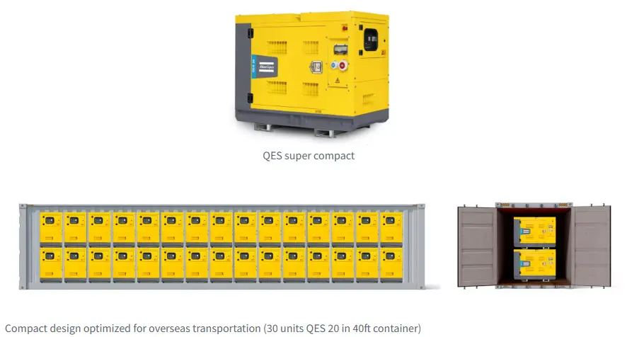 Den innovative superkompakte QES-modellen er designet for å gi den mest effektive transporten. Du kan montere opptil 30 enheter av Atlas Copco QES 20 i en 40 fots container, det meste for en 20kVA kraft Atlas Generator på markedet! Det betyr optimalisert transport, reduserte CO2-utslipp og driftskostnader, noe som gir en lavere Total Cost of Ownership (TCO). Dens miljøvennlige design gjør den ideell for lagring i utlandet, og reduserer eksponentielt fotavtrykket ditt på stedet.